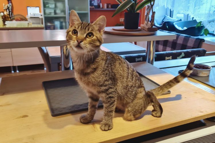 Ich wurde als kleines Kätzchen mit leider total verkrüppelten Hinterbeinen gefunden. Ich knicke hinten beim Gehen komplett ein und mein Rücken ist nach unten gekrümmt, sodass offensichtlich war, dass mit mir etwas nicht stimmt. Ich kam zum Dechanthof und wurde dort eingehend von den Tierärzten untersucht, ja sogar eine Computertomographie war nötig, um zu sagen, was mit mir los ist.